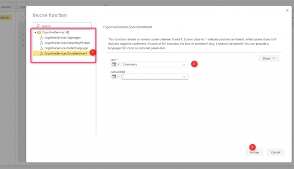 Затем просто нажмите на Invoke. Будет показана новая страница с исходным столбцом (Comment ) и новым столбцом с добавленным именем Cognitive Service. Этот новый столбец имеет значение от 0 до 1 для каждой строки.